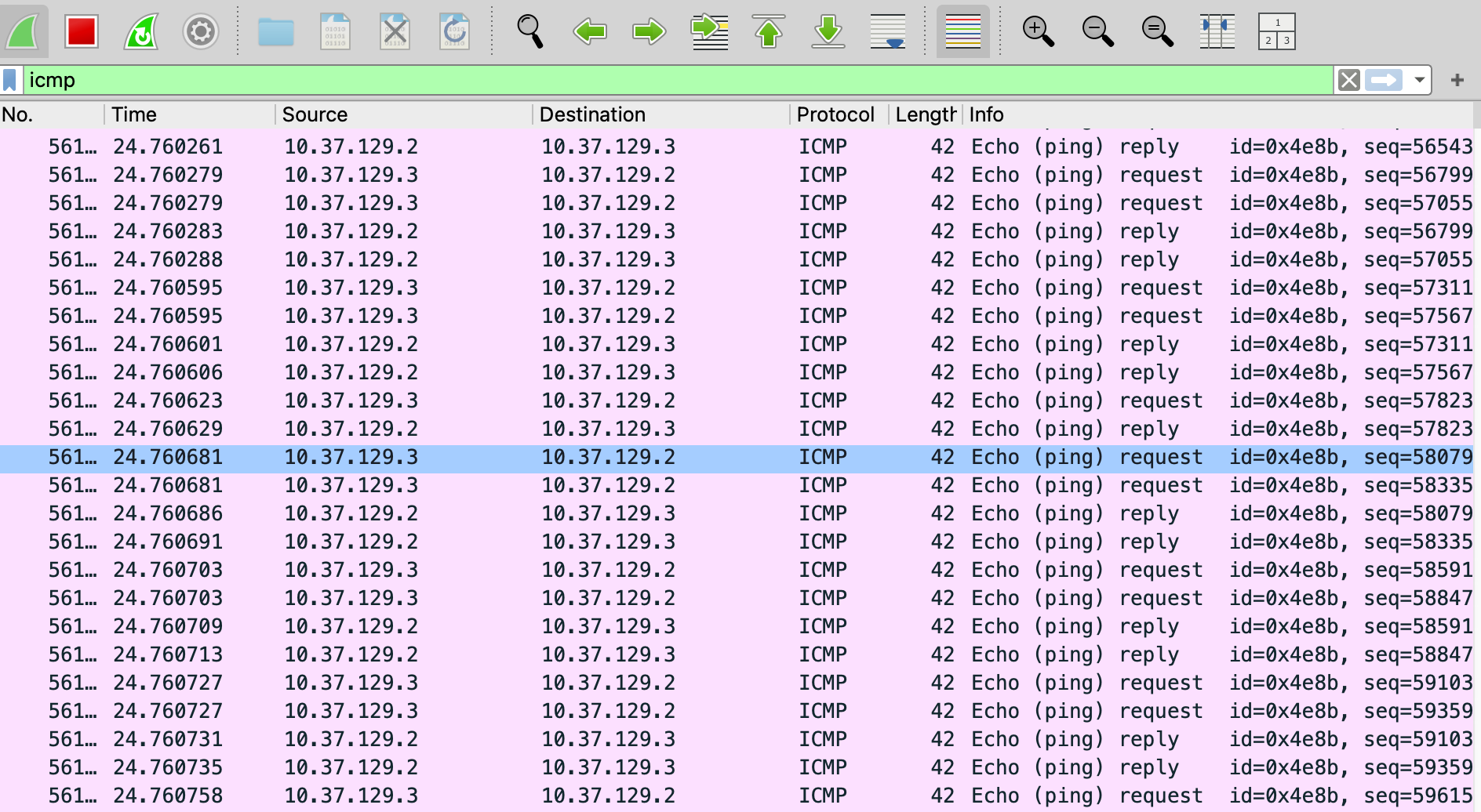 Wireshark: stop after a few seconds → Statistics → I/O Graph; compare pps before/during flood. Filter: icmp.