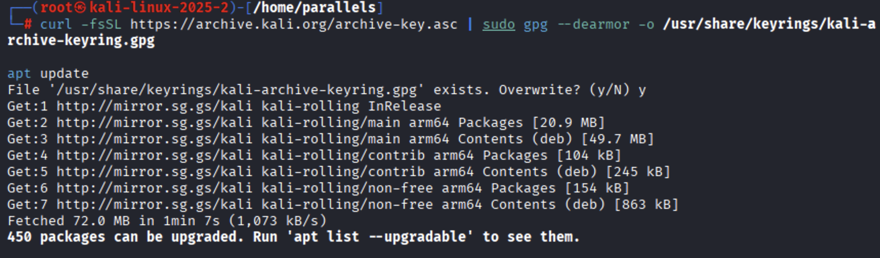 Ensure your package lists are up to date. First, do an import and save the GPG (GNU Privacy Guard) key from the Kali Linux repository into the system: